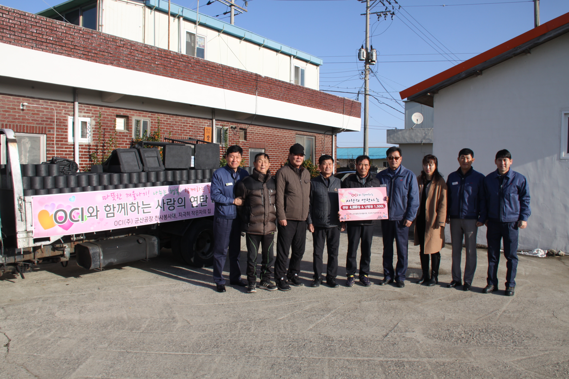 OCI(주) 군산공장(공장장 한철) 천사봉사대가 5일 공장 인근 결연마을 내 어려운 이웃들에게 연탄 4,000장, 난방유 1,000리터를 후원하는 전달식을 가졌다.