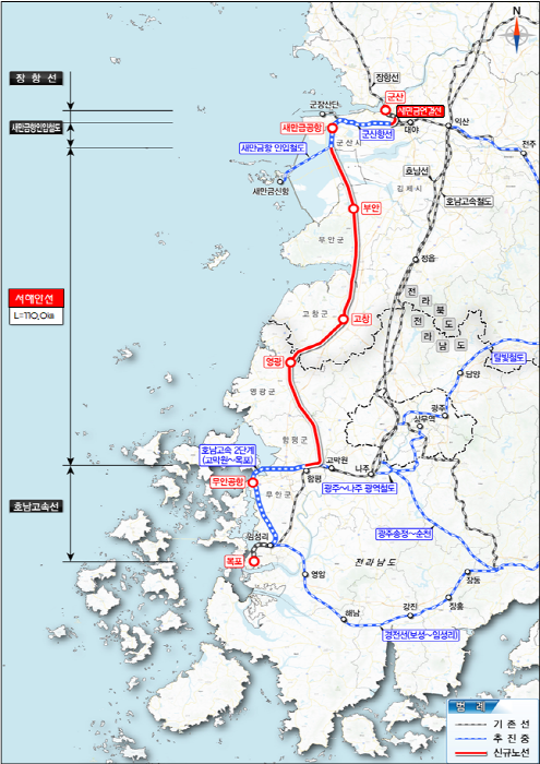 세부적으로 서해선~장항선~새만금선~군산목포선을 연결하는 서해안 중심의 남북축 완성으로 군산~부안~고창~영광~함평~무안~목포 간 철도를 신설하자는 내용이다.