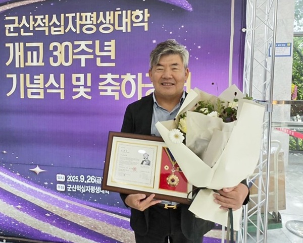 군산 음식물폐기물 처리업체 ㈜금호엔비텍 이지태 대표가 지난 26일 군산적십자평생대학 개교 30주년 기념식에서 지속적 나눔으로 지역사회에 선한 영향력을 끼치고 있는 공로로 대한적십자사(회장 김철수) 포장(褒章)을 수상했다.