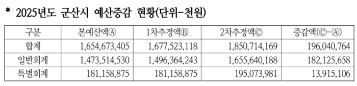 또한 군산시 올해 예산은 본예산대비 1차 추가경정예산은 228억원(1.38%) 증가했으며 2차 추경에서 1,731억원(10.32%)이 늘어 총 1,960억원 증가했다.
