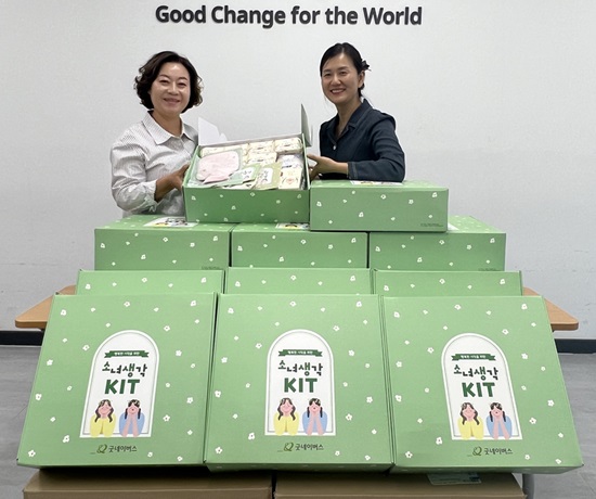 굿네이버스 ‘소녀생각 KIT’는 입는 오버나이트를 포함한 다양한 사이즈로 구성된 3개월 분량의 유기농 생리대, 구미 영양제, 여드름패치, 보온 물주머니 등으로 구성됐다.