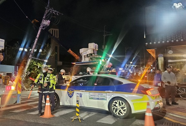 27일 오후 5시 7분 군산시 나운동 삼거리를 지나던 승용차가 전신주를 들이받는 사고가 발생했다.