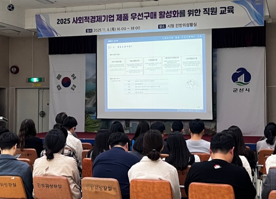 군산시는 지난 6일 공공구매 담당 직원 대상 ‘2025 사회적경제기업 제품 우선구매 활성화를 위한 직원교육’을 시청 민방위상황실에서 개최했다.