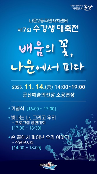 나운2동과 나운2동 주민자치위원회는 오는 14일 군산예술의전당 소공연장에서 ‘제7회 수강생 대축전–배움의 꽃, 나운에서 피다’를 개최한다.
