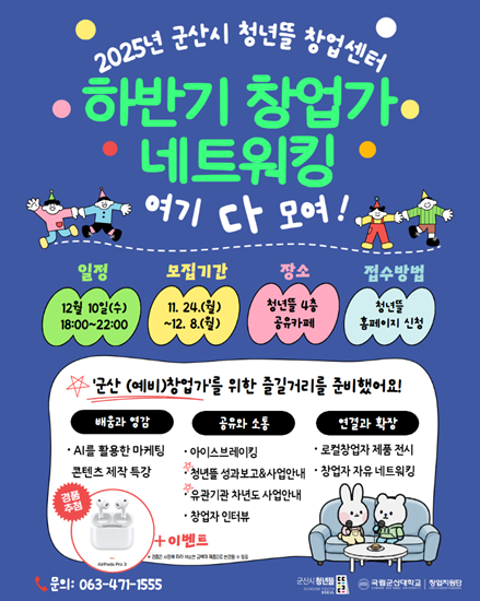 군산시 청년뜰 창업센터에서 지역 창업가 간 정보공유와 네트워킹 강화를 위한 ‘2025년 하반기 창업가 네트워킹’의 참여자를 내달 8일까지 모집한다.