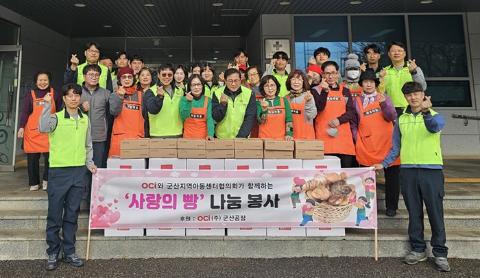 OCI 군산공장(공장장 심재엽, 노동조합위원장 장육남)과 군산희망틔움봉사단이11일 연말을 맞아 지역 취약층과 군산지역아동센터를 위해 ‘사랑의 빵’ 1,600개(약 300만 원 상당)를 만들어 전달하는 나눔 활동을 진행했다.
