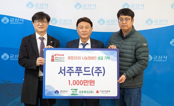 서주푸드㈜(대표 고승주)는 24일 관내 어려운 이웃을 위해 써달라며 이웃돕기 성금 1,000만 원을 군산시에 전달하며 ‘희망 2026 나눔 캠페인’에 참여했다.