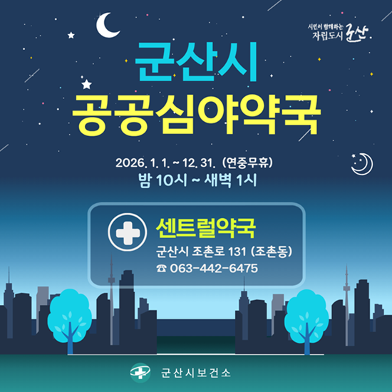 공공심야약국(센트럴약국, 군산시 조촌로 131, ☎ 063-442-6475)은 오후 10시부터 다음날 새벽 1시까지 365일(연중무휴) 운영되며 심야시간에도 약사와 상담을 통해 안전한 의약품 복용이 가능하도록 지원하고 있다.