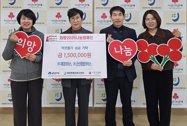 황은호 개정면장은 “어려운 이웃을 위한 따뜻한 나눔을 실천해주신 ㈜재경모터스와 ㈜군산종합모터스에 감사드린다”며 “기탁된 성금은 지역 내 저소득 취약층과 복지 사각지대에 놓인 이웃들을 돕는 데 사용하겠다”고 말했다.