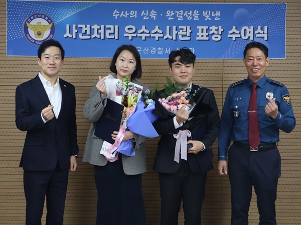 군산경찰서 박대용 경위와 최선미 경사가 신속하고 완결성 있는 수사를 통해 국민 신뢰 제고에 기여한 공로로 우수 수사관으로 선정됐다.