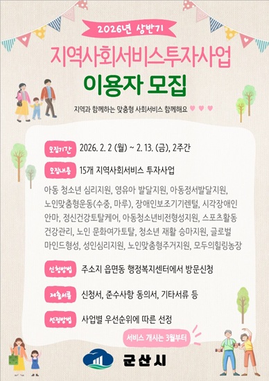 군산시가 올해 상반기 지역사회서비스 투자사업 이용자를 내달 2일부터 13일까지 2주간 모집한다.