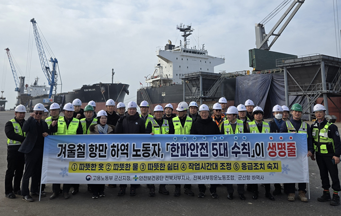 고용노동부 군산지청(지청장 김재훈)은 4일 군산항 7부두에서 항만 하역 근로자의 한랭질환 예방과 안전사고 방지를 위해 안전보건공단, 군산항 하역사, 항운노조와 함께 ‘노·사·정 합동 현장점검 및 간담회’를 개최했다.