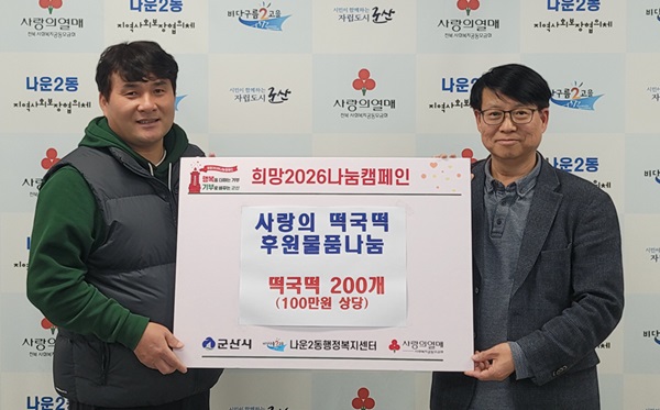 남귀우 나운2동장은 “꾸준히 이웃사랑을 실천해 주시는 손기환 대표께 깊이 감사드린다”며 “행복나눔 공유곳간을 통해 더욱 따뜻한 나눔 문화가 확산되도록 노력하겠다”고 전했다.