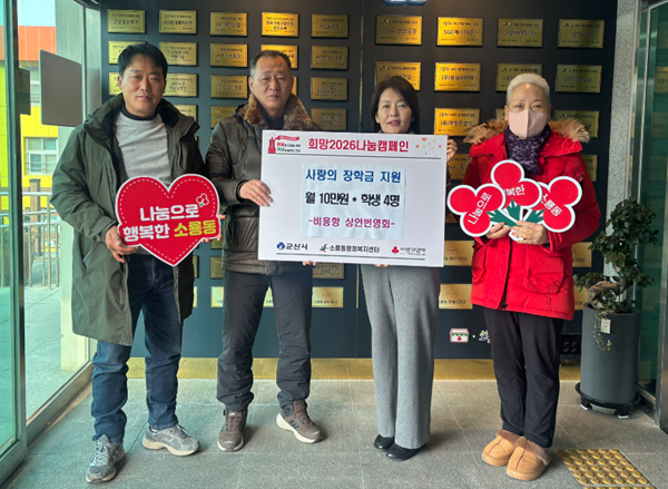 상인번영회는 9일 소룡동행정복지센터에서 장학금 기탁식을 갖고 조손가정, 한부모 가정 등 취약층 초·중학생 4명에 장학금을 전달됐다.