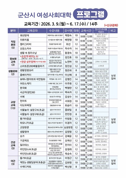 군산시 여성사회대학이 오는 3월 9일부터 분야별 31개 강좌가 운영된다.