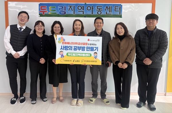 군산종합사회복지관(관장 황성덕)은 지난 26일 한화에너지(주) 군산공장의 후원으로 전북사회복지공동모금회 지원사업인 ‘사랑의 공부방 만들기’ 기탁식을 두드림지역아동센터에서 진행했다고 밝혔다.