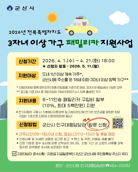 군산시는 저출생 위기를 극복하고자 ‘2026 전북자치도 3자녀 이상 가구 패밀리카 지원사업’ 참여자를 모집한다.