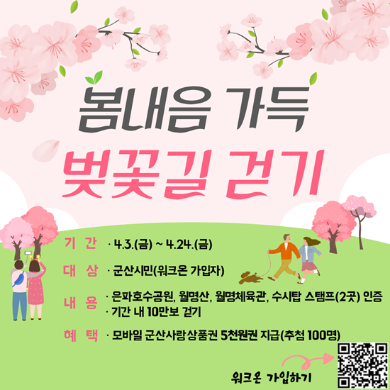 참여 방법은 은파호수공원, 월명산, 월명체육관, 수시탑 등 군산의 주요 벚꽃 명소 코스 중 2곳 이상의 스탬프를 인증하고 기간 내 총 10만 보 걷기를 달성하면 된다.