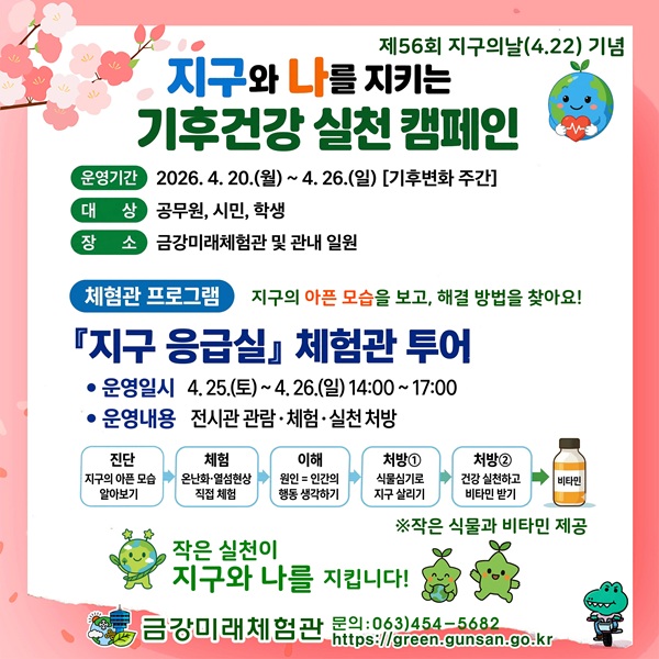 오는 22일 제56회 지구의 날과 기후변화주간을 맞아 시민들의 기후위기 대응 참여 유도를 위해 20일부터 26일까지 ‘지구와 나를 지키는 기후건강 실천 캠페인’을 운영한다.