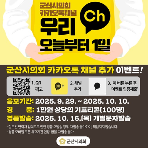 군산시의회(의장 김우민)가 온라인을 통한 시민 소통을 확대하기 위해 카카오톡 채널 추가 이벤트를 진행한다.
