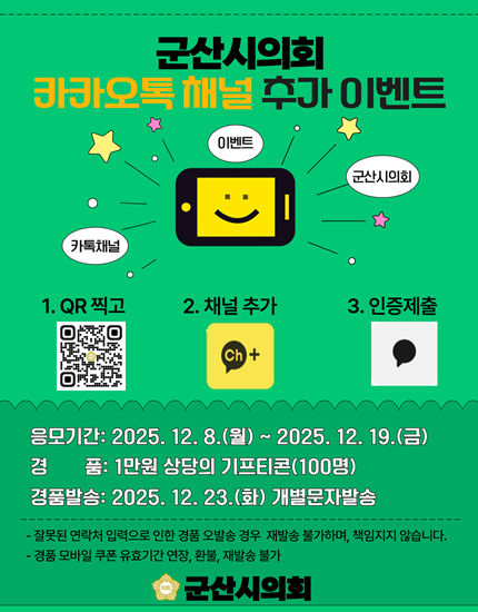 참여 방법은 카카오톡 앱 검색창에서 ‘군산시의회’를 검색하거나 이벤트 참여 QR코드 스캔 후 채널을 추가해 해당 화면 캡처와 네이버 폼으로 제출하면 된다.