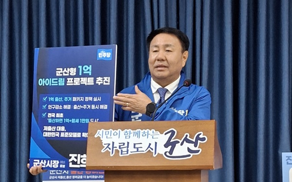 진 후보는 19일 군산시청 브리핑룸에서 기자회견을 열고 “대한민국은 세계 최저 수준의 합계출산율을 기록하고 있고 군산 역시 출생아 감소와 청년 유출이라는 이중 위기에 직면해 있다”며 “단순한 현금 지원을 넘어 주거와 소득 구조까지 함께 바꾸는 근본 정책이 필요하다”고 강조했다.