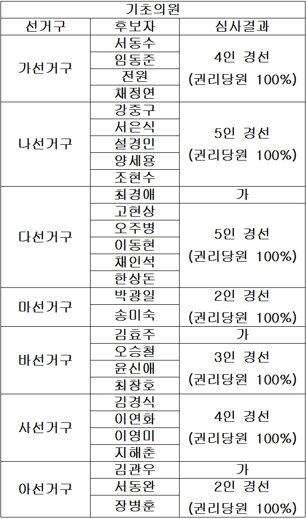 다선거구는 고현상, 오주병, 이동현, 채인석, 한상돈 5인, 마선거구 박광일, 송미숙 2인, 바선거구는 오승철, 윤신애, 최창호 3인, 사선거구 김경식, 이연화, 이영미, 지해춘 4인, 아선거구 서동완, 장병훈 2인 경선으로 정해졌다.