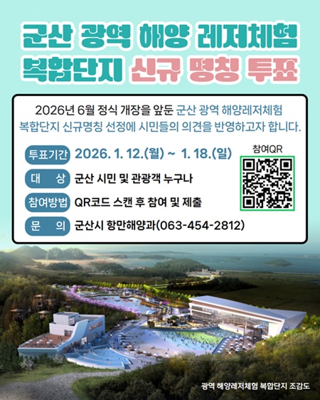 군산시 관계자는 “군산 광역해양레저체험 복합단지는 시민을 위한 공공시설인 만큼 명칭 선정 과정에서도 시민의 의견을 폭넓게 반영하고자 한다”며 “공정성과 전문성을 함께 확보한 만큼 많은 시민의 적극 참여를 기대한다”고 밝혔다.