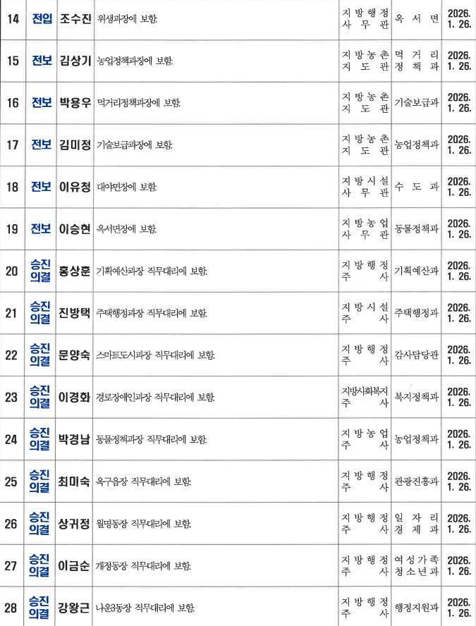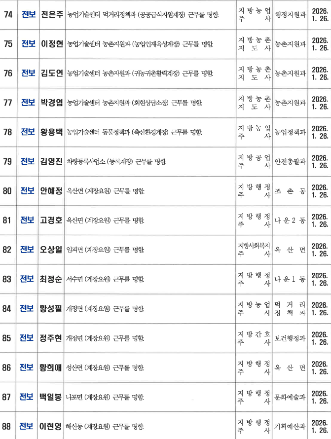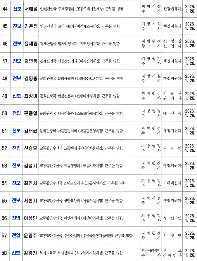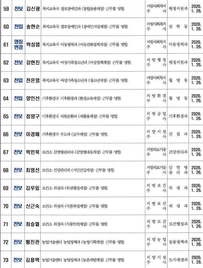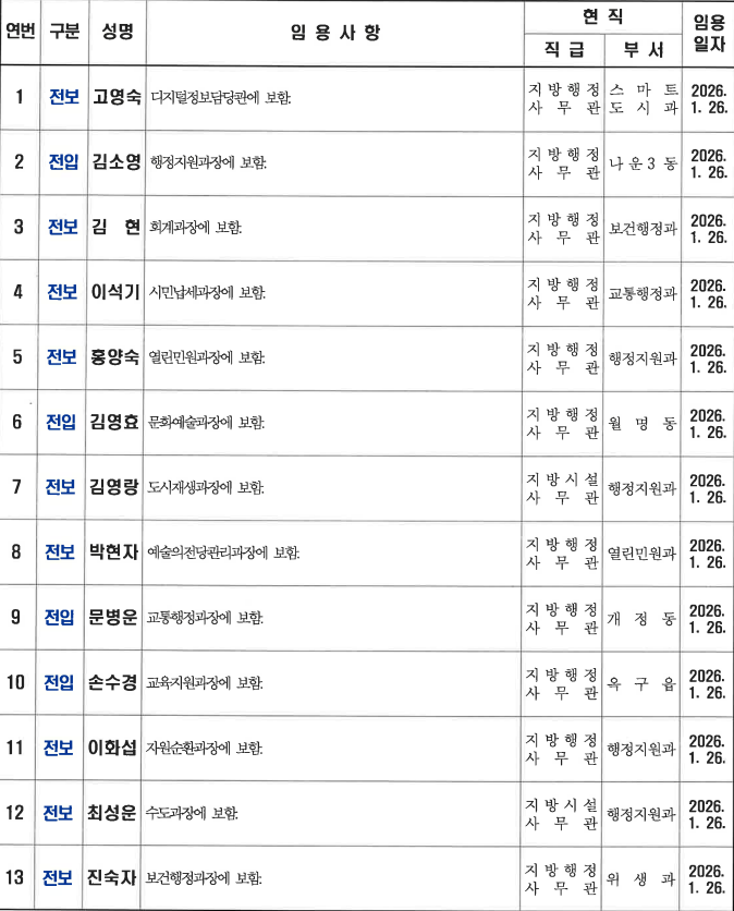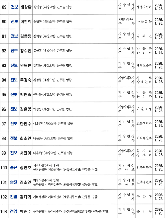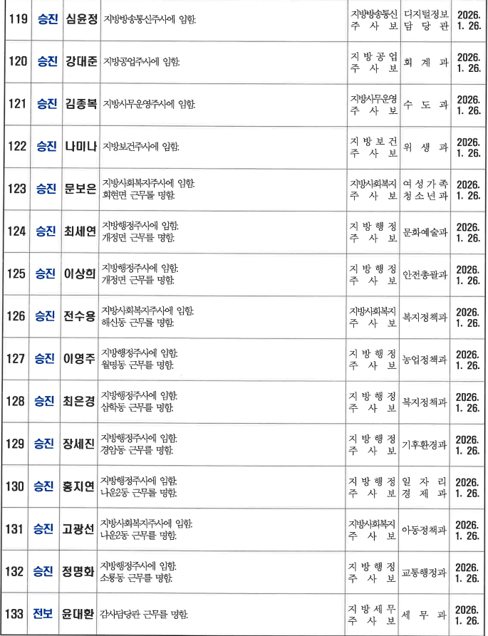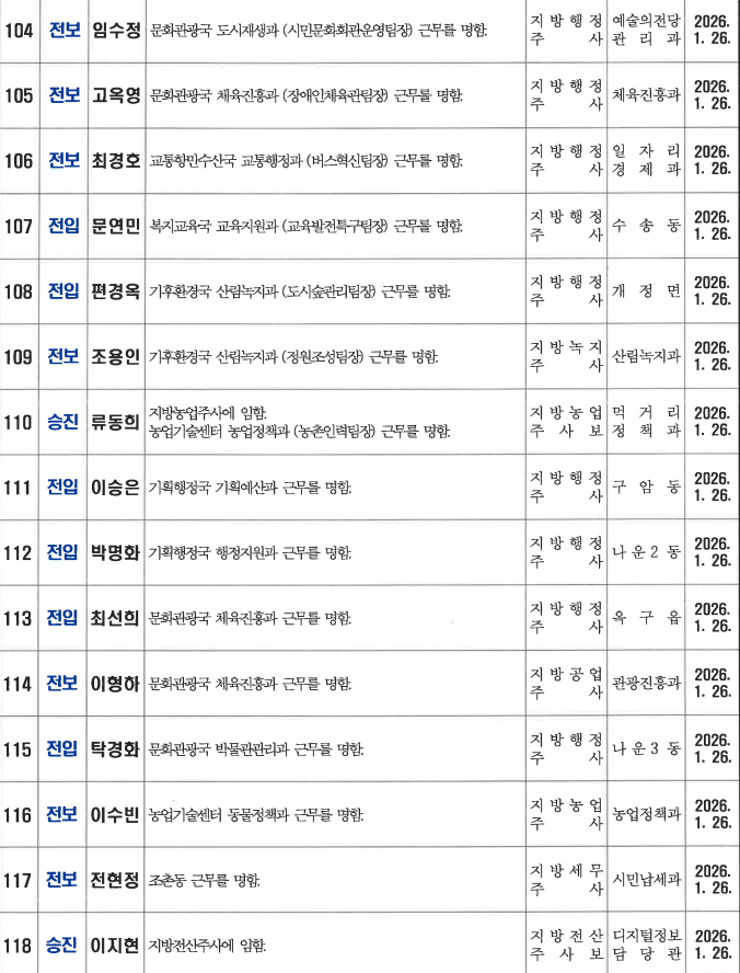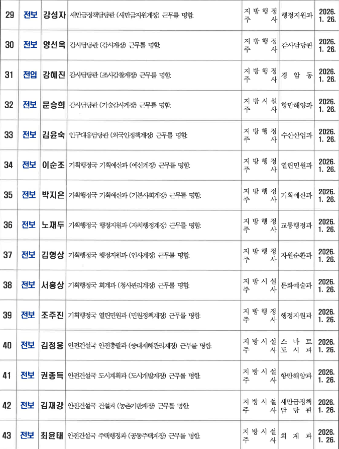 군산시는 23일 오후 1월 26일자 상반기 정기인사 명단을 발표했다.