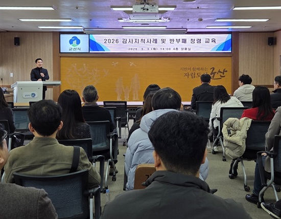 군산시는 지난 3일 시청 상황실에서 27개 읍·면·동 회계업무 담당 계장 및 직원 대상으로 ‘감사사례 및 부패방지 청렴 교육’을 실시해 행정 신뢰도 제고와 청렴 문화 확산 계기를 조성했다.