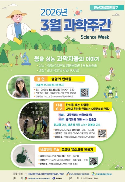 군산시와 군산교육지원청 지원으로 마련된 이번 행사는‘봄을 심는 과학자들 이야기’ 주제로 진행된다.