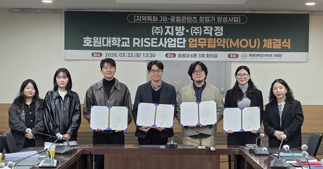 호원대 RISE사업단은 23일 교내 회의실에서 ㈜지방, ㈜작정과 ‘지역특화 JB-로컬콘텐츠 창업가 양성사업’ 추진을 위한 업무협약을 체결했다고 밝혔다.