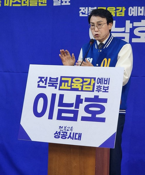 이남호 전북교육감 예비후보는 26일 군산시청 브리핑룸에서 기자회견을 갖고 새만금 산업 대전환과 군산 산업·관광·의료 지형 변화를 교육과 연결한 발전 방안으로 ‘군산 6+2 종합 교육 마스터플랜’을 발표했다.