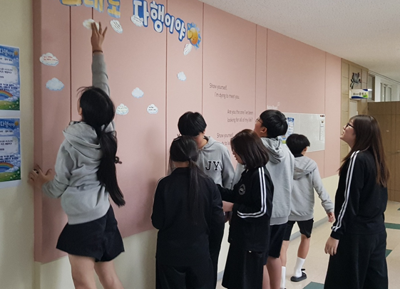 학생들은 쉬는 시간과 점심시간을 활용해 위클래스(Wee Class) 상담실을 방문, 준비된 구름 모양 카드에 ‘한 줄 다행일기’를 작성한 뒤 학교 식당에 마련된 푸른 하늘 배경 게시판에 이를 직접 부착하는 방식으로 참여하고 있다.