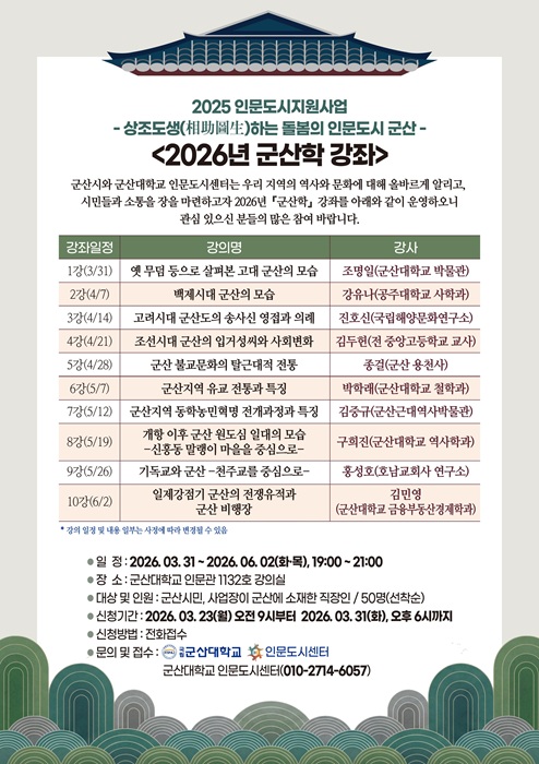 교육부‧한국연구재단 주최, 군산시‧군산대 인문도시센터가 주관하는 이번 강좌는 지역 역사와 문화, 사회적 의미를 인문학적 시각에서 조명하고 시민과 함께 지역 정체성을 탐구하기 위해 마련됐다.