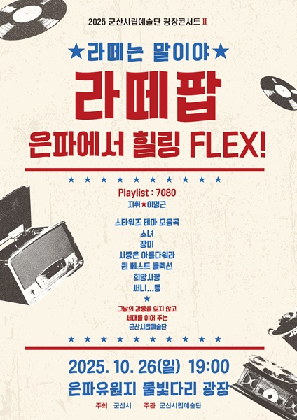 깊어가는 가을 군산시립예술단이 시민들과 더욱 가까이 호흡하기 위해 26일 오후 7시 은파호수공원 물빛다리 야외무대에서 광장콘서트 ‘라떼팝 콘서트’를 개최한다.