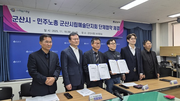 군산시와 민주노총 공공운수사회서비스노조 군산시립예술단지회가 시립예술단의 운영 안정화와 지속 발전을 위한 단체협약을 18일 체결했다.