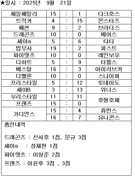 A조 드래곤즈와 타타대우는 베어스와 세아a를 이기고 1‧2위 자리를 굳건히 지켰다.