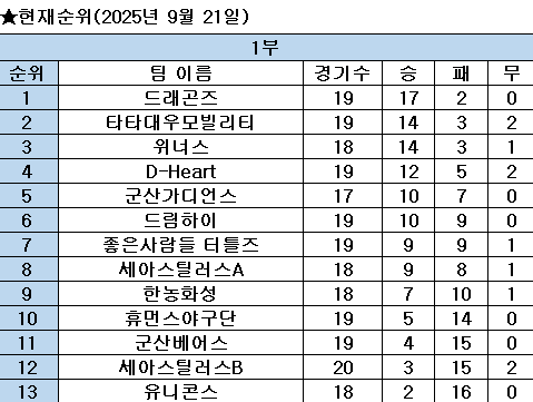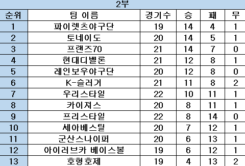 또 9위 패션은 최상위팀인 브라더스를 9대 2로 이기며 7위로 올라섰다.