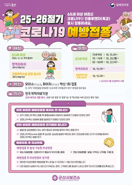 예방접종은 ▲10월 15일부터 75세 이상 ▲10월 20일부터 70~74세 ▲10월 22일부터 65~69세 연령대별로 순차적으로 실시한다.