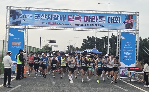 군산시육상연맹(회장 송공섭)은 지난달 26일 새만금방조제 해넘이 휴게소 하부도로에서 ‘2025 군산시장배 단축마라톤대회’를 성황리에 개최했다.
