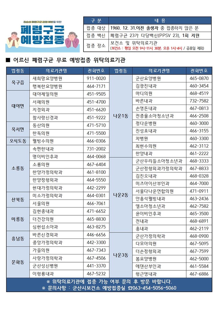 군산시 보건소 관계자는 “1960년생은 12월 접종을, 곧 대상이 되는 1961년생은 새해 첫 접종을 권장한다”며 “폐렴구균 예방접종은 평생 1회만 맞으면 되는 만큼 건강하고 활기찬 노후를 보내길 바란다”고 전했다.