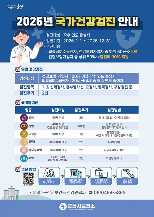 군산시 보건소 관계자는 “우리나라 사망원인 1위인 암 예방을 위해 국가 암 검진에 적극 참여해 주시기 바란다”며 “연말에는 검진 수요가 집중되는 만큼 상반기에 미리 검진을 받는 것을 권장한다”고 말했다.