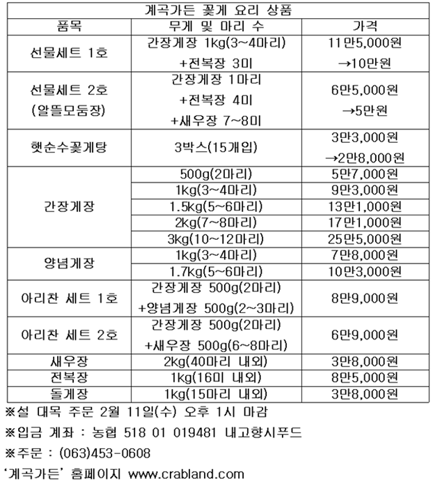 간장게장 1kg(3~4마리)과 전복장 3미를 함께 담은 선물세트 1호(가격 11만5,000원)를 10만원에 할인 판매한다.