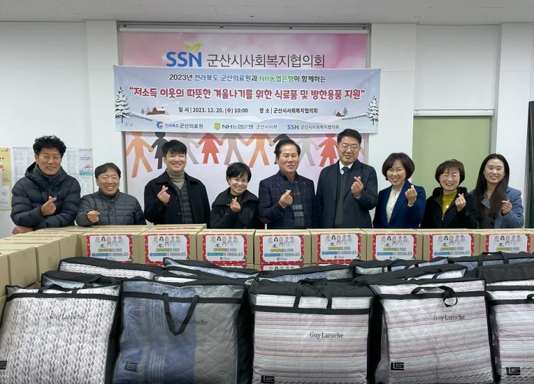 군산의료원(원장 조준필)과 농협은행 군산시지부(지부장 최승웅)는 지난 20일 연말을 맞아, 군산시사회복지협의회(회장 홍용승)에서 저소득 이웃의 따뜻한 겨울 보내기에 도움이 되고자 물품꾸러미를 전달식을 가졌다.
