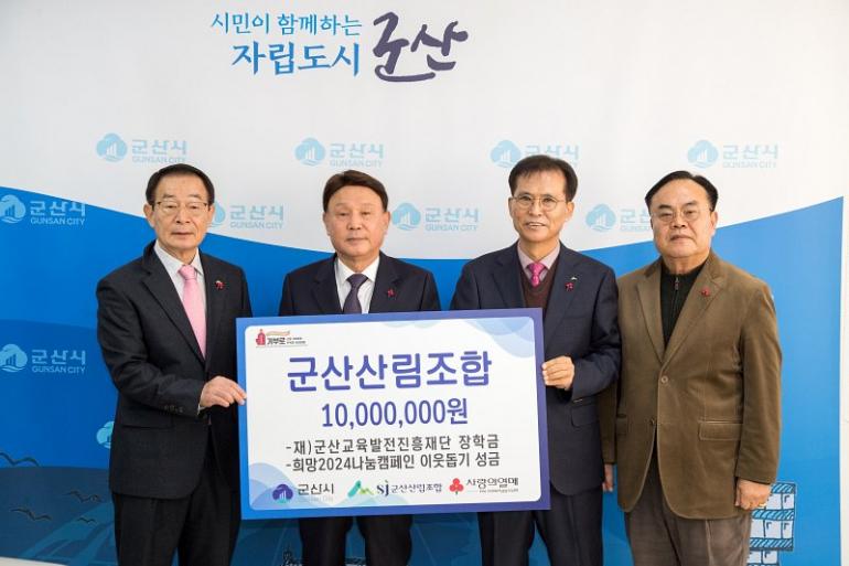 군산산림조합은 15일, 희망 2024 나눔캠페인에 동참하며, 이웃돕기 성금과 군산교육발전진흥재단 장학금으로 각 500만원씩 총 1,000만원을 군산시에 기탁 했다.