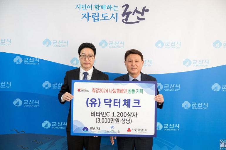 건강기능식품 전문회사 닥터체크(대표 김성열)가 29일 자사의 건강기능식품 ‘월퍼데이 트루 비타민c’(1개월분)를 1,200박스(3,000만원 상당)를 군산시에 기탁했다.