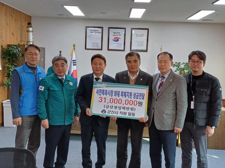 군산시 전 직원들이 서천 특화시장 화재로 피해를 입은 상인들을 돕기 위해 성금 3,100만원을 전달했다.