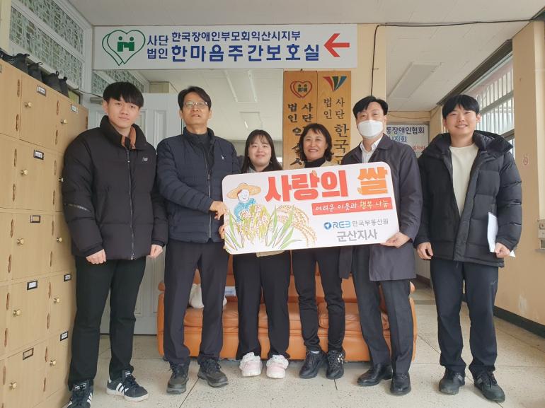 군산지사는 지난 1일 익산시 남중동에 위치한 한마음주간보호센터를 방문해 이웃과 함께하는 명절맞이 사랑의 쌀을 전달했다.
