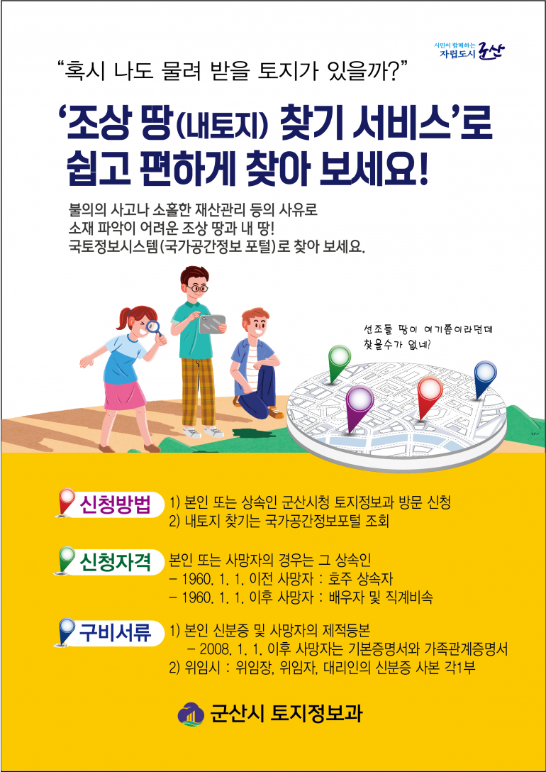 신청방법도 간단하다. 본인 또는 상속인이 신분증과 상속인임을 증명하는 서류(제적등본‧기본증명서‧가족관계증명서 등)를 구비해 시청 토지정보과(454-3965)로 직접 방문하거나 정부24, K-Geo 플랫폼, 국가공간정보포털 사이트를 통해 온라인으로 신청하면 토지 소유 현황을 확인할 수 있다.